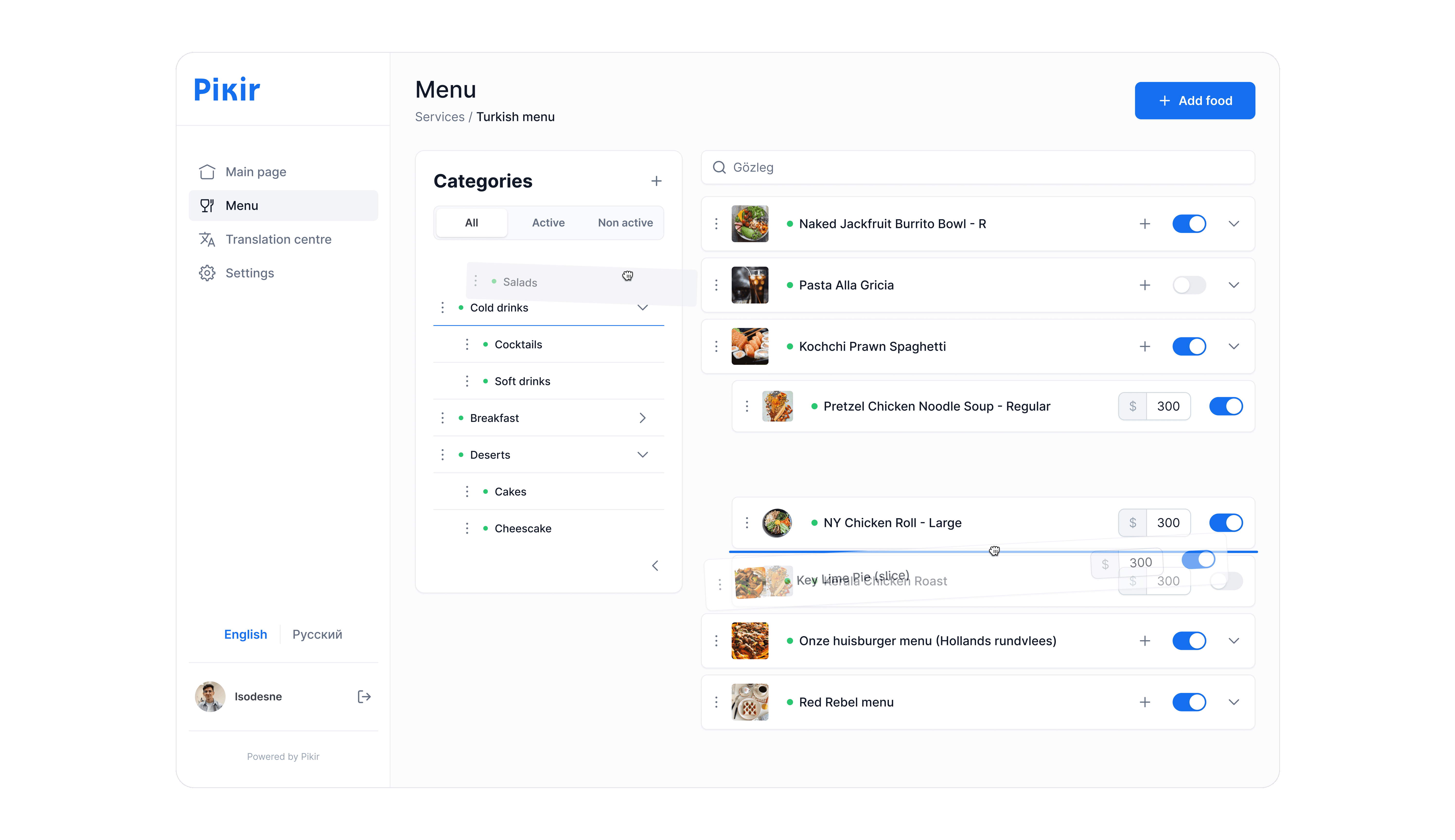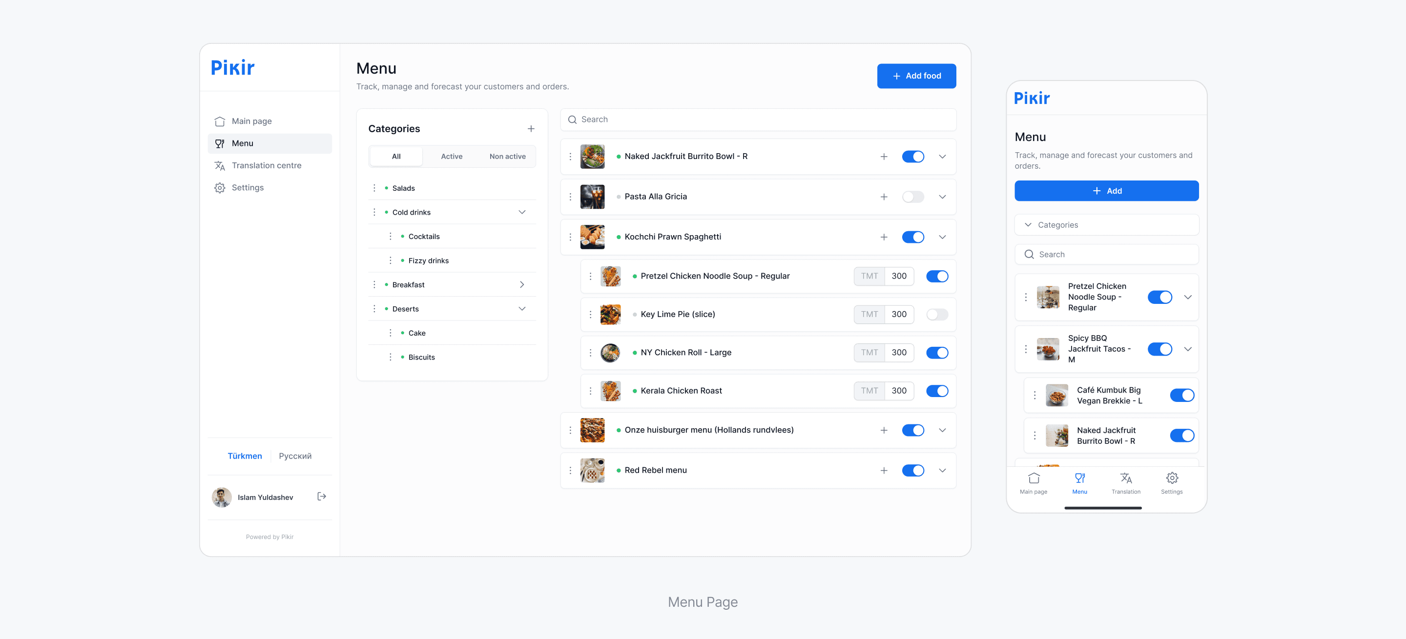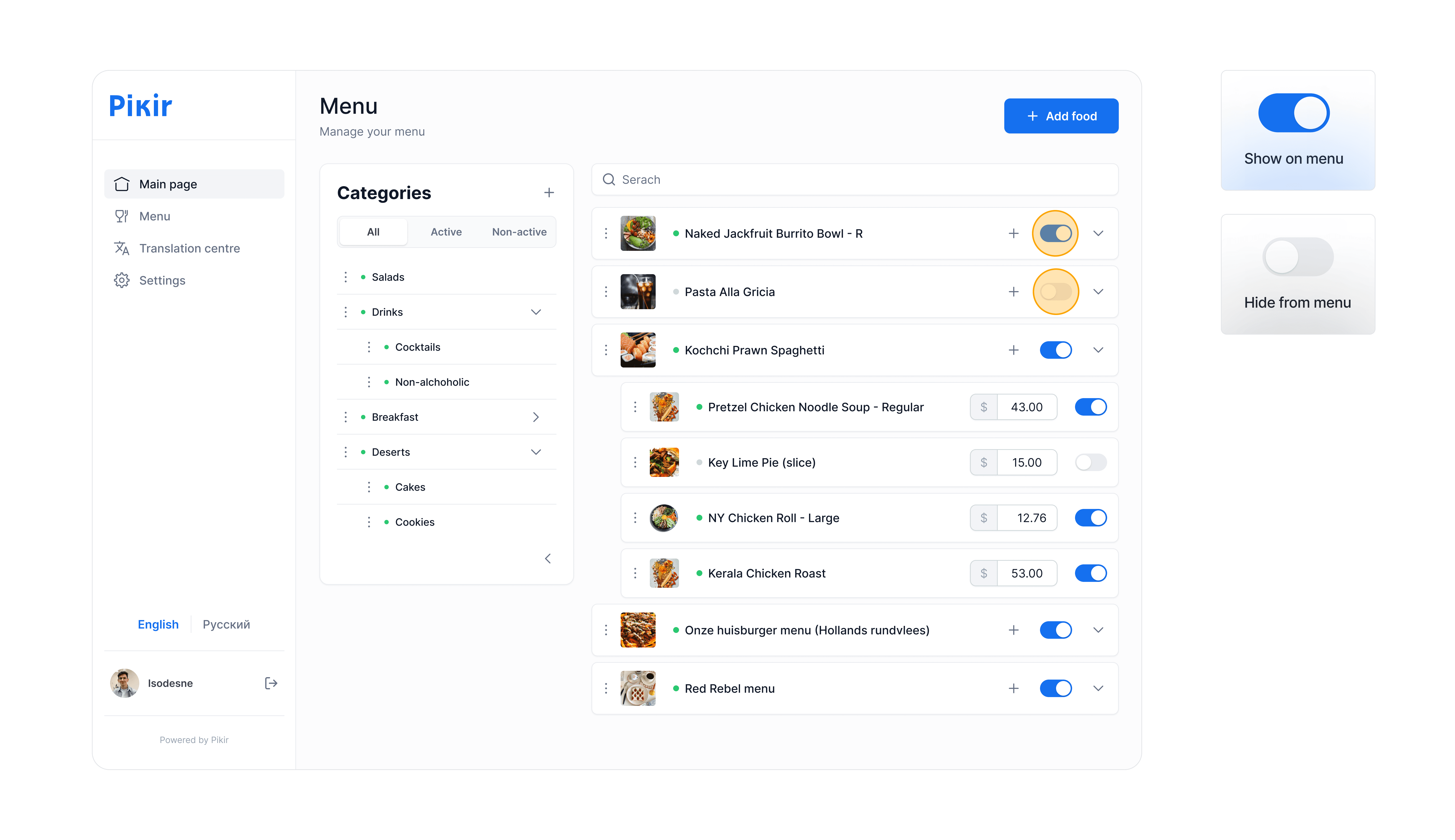 We added a toggle switch for each meal and category, allowing restaurant managers to easily show or hide items on the menu. When we demonstrated this to restaurant managers, they loved the simplicity and time-saving aspect of not having to delete items, just hiding them. It seemed simple, but we only discovered it by empathizing and talking with our users.