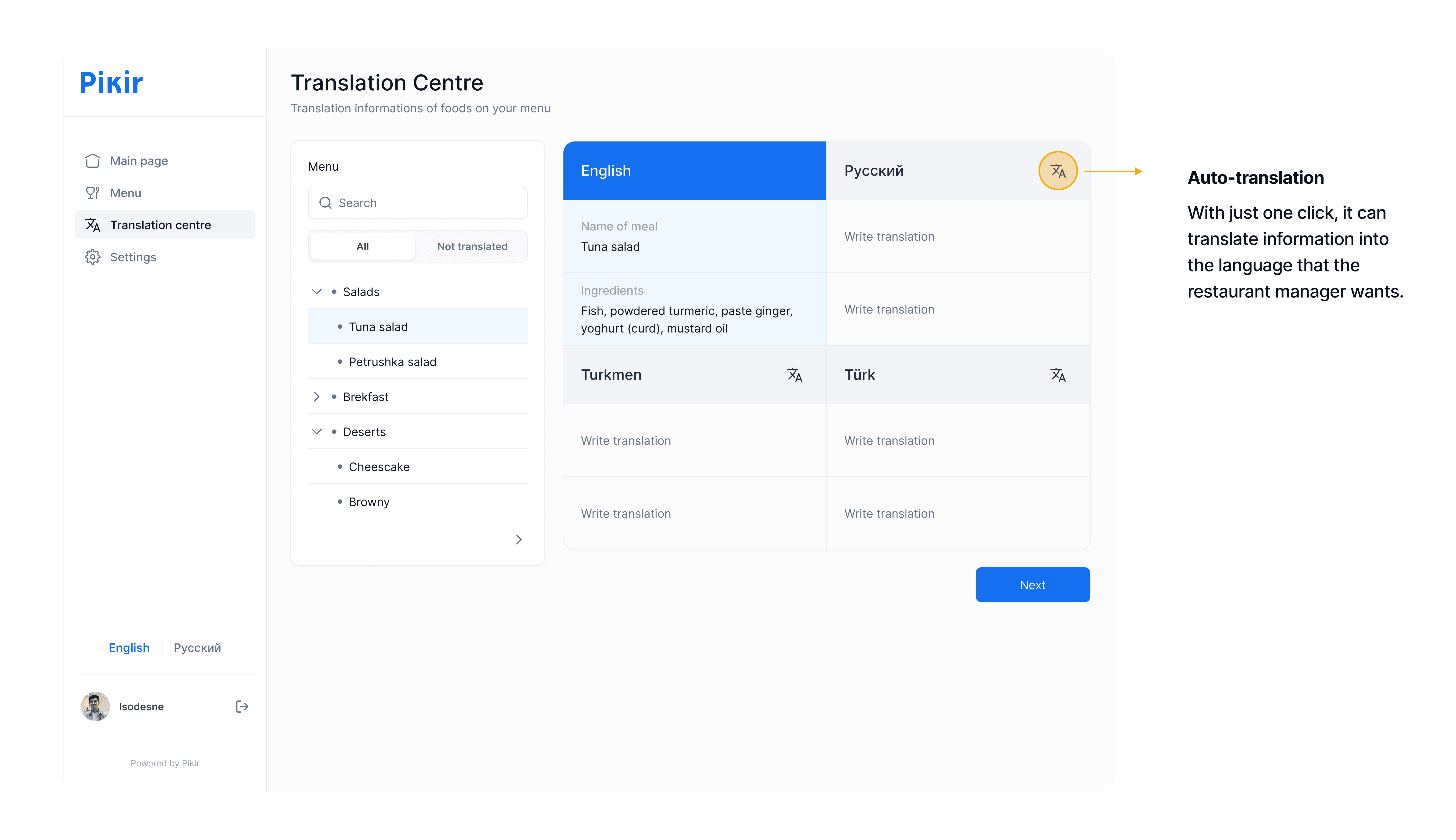 To help managers translate meal names and ingredients into different languages easily. After adding meal names and ingredients, users can go to the translation center and use the auto-translate feature to translate into any language they want.